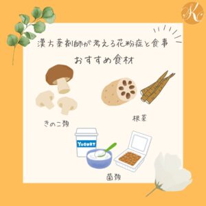 キノコ類・根菜(れんこん、ごぼう)・菌類(ヨーグルト、納豆)など、